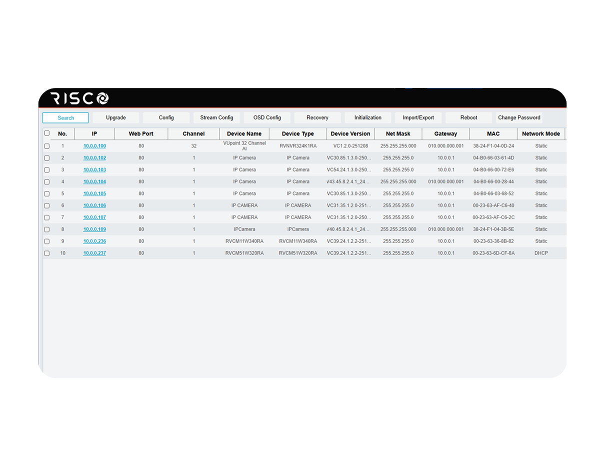 The RISCO Search Tool is a PC-based utility that streamlines video device set up and maintenance. Discover devices connected to the network