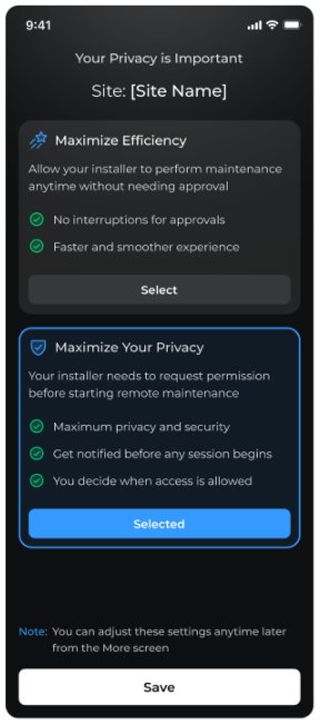 - Se a opção “Maximizar a sua privacidade” estiver selecionada, o instalador apenas poderá aceder ao sítio depois de o utilizador final aprovar a solicitação de manutenção previamente enviada pelo instalador.