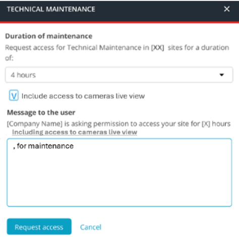 Os instaladores podem solicitar o Acesso Remoto à Configuração das Câmaras como parte da sessão de manutenção. Para sítios com manutenção ilimitada, o Acesso Remoto à Configuração das Câmaras é solicitado separadamente a partir do próprio sítio.