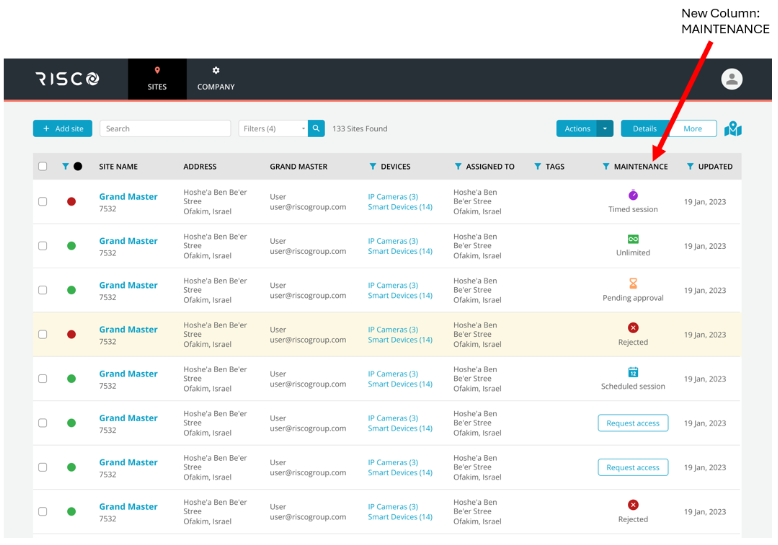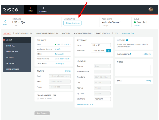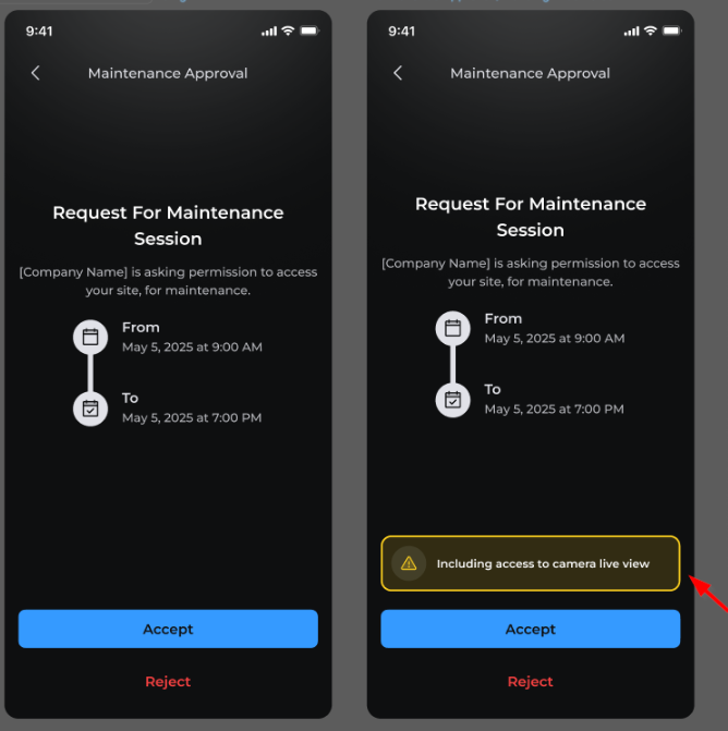 Este documento descreve as atualizações da RISCO Cloud destinadas a aprimorar a privacidade do utilizador final em relação às sessões de manutenção técnica. Esta versão proporciona maior visibilidade da manutenção técnica, reforça os fluxos de aprovação e notificação e oferece maior controlo sobre o acesso às câmaras, aumentando assim a privacidade dos utilizadore do sítio.