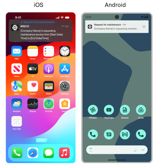 O aplicativo iRISCO informa os utilizadores finais sobre eventos relacionados à manutenção através de notificações no ecrã e permite que eles realizem ações, visualizando, aceitando ou rejeitando solicitações de manutenção.